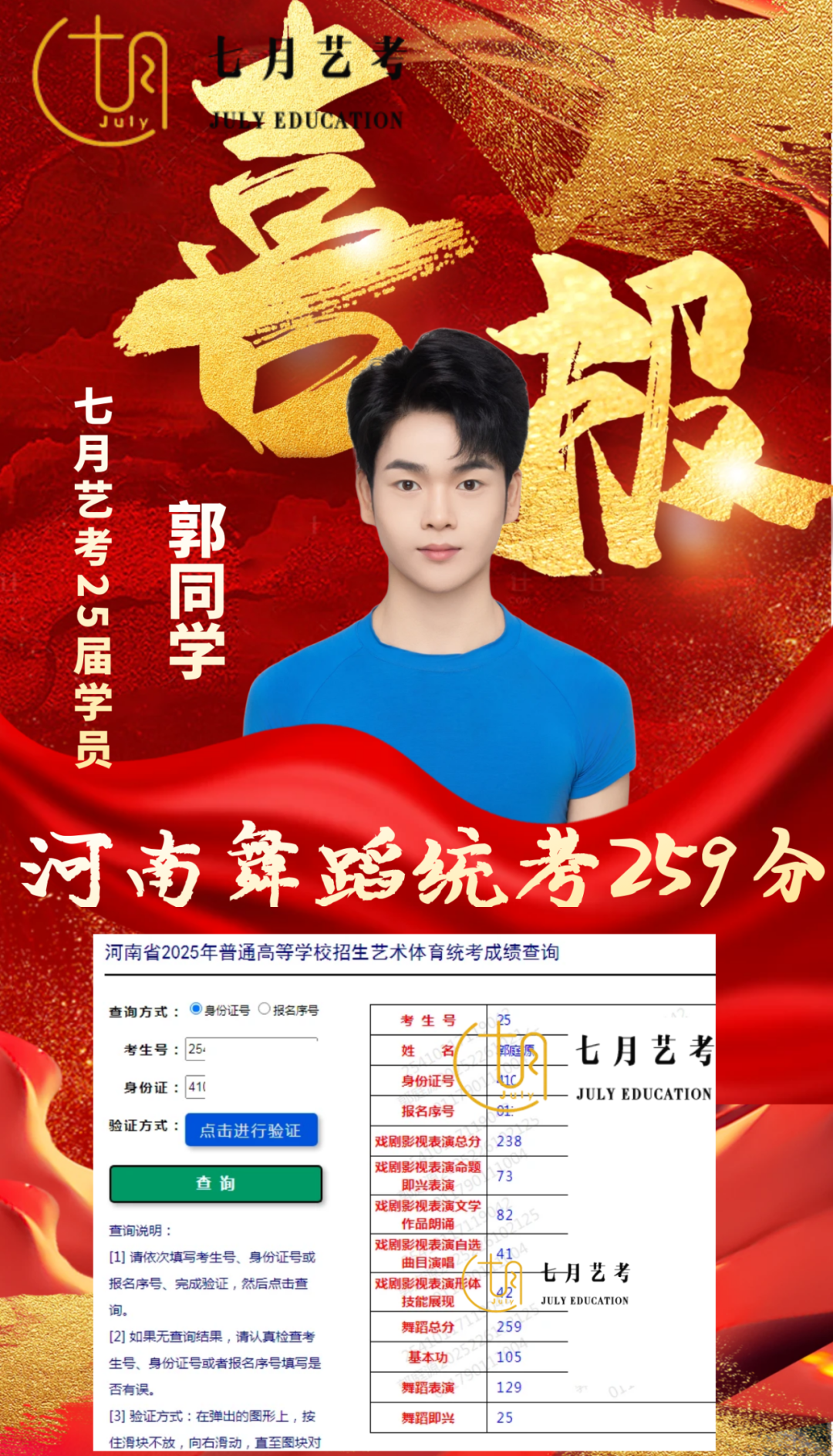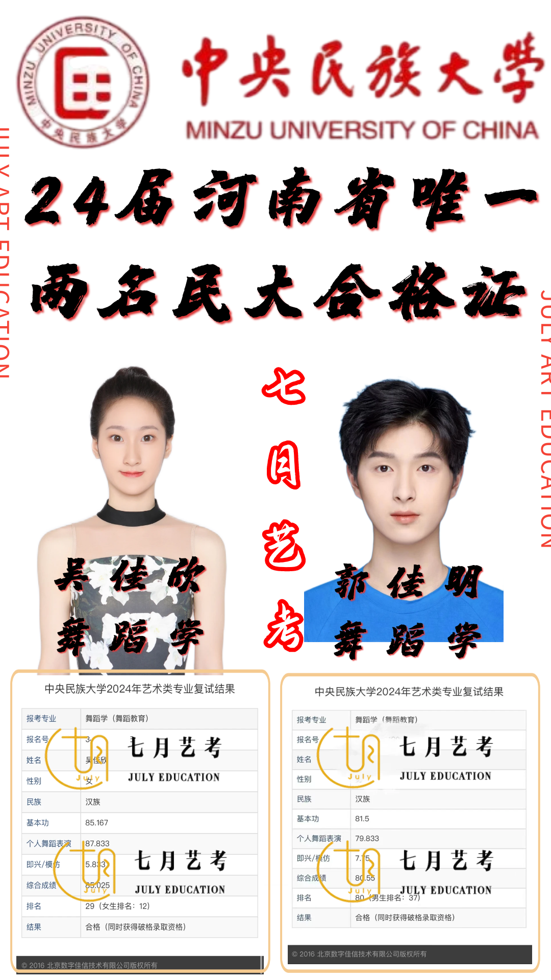 七月艺考占中央民族大学近五年来在河南省录取人数总比80%以上,其中23届郭馨文取得全国第*名的好* 校考战绩位居全国前列.