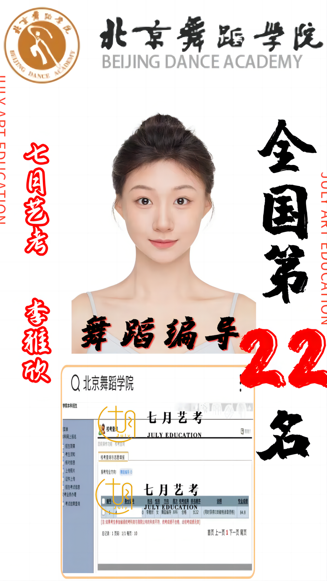 七月艺考专注于舞蹈艺术升学十五年,总部位于北京市海淀区,2018年郑州校区创立起,获得中央民大舞蹈表演全国第*名,全国第二名,舞蹈教育全国第六名,第九名,第十一名,第十二名,第十九名,中戏舞剧全国第三名,河南第*,天音舞表全国第*,沈音舞蹈学全国第*名、沈音舞表全国第四名,全国第九名等。河南省统考始终保持全员过关,本科率达到百分之九十五以上,*一直保持,成为全国学生优选艺考品牌。