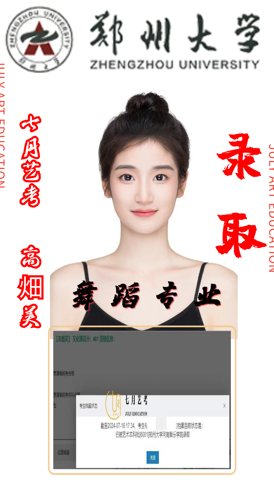 七月艺考占中央民族大学近五年来在河南省录取人数总比80%以上,其中23届郭馨文取得全国第*名的好* 校考战绩位居全国前列.