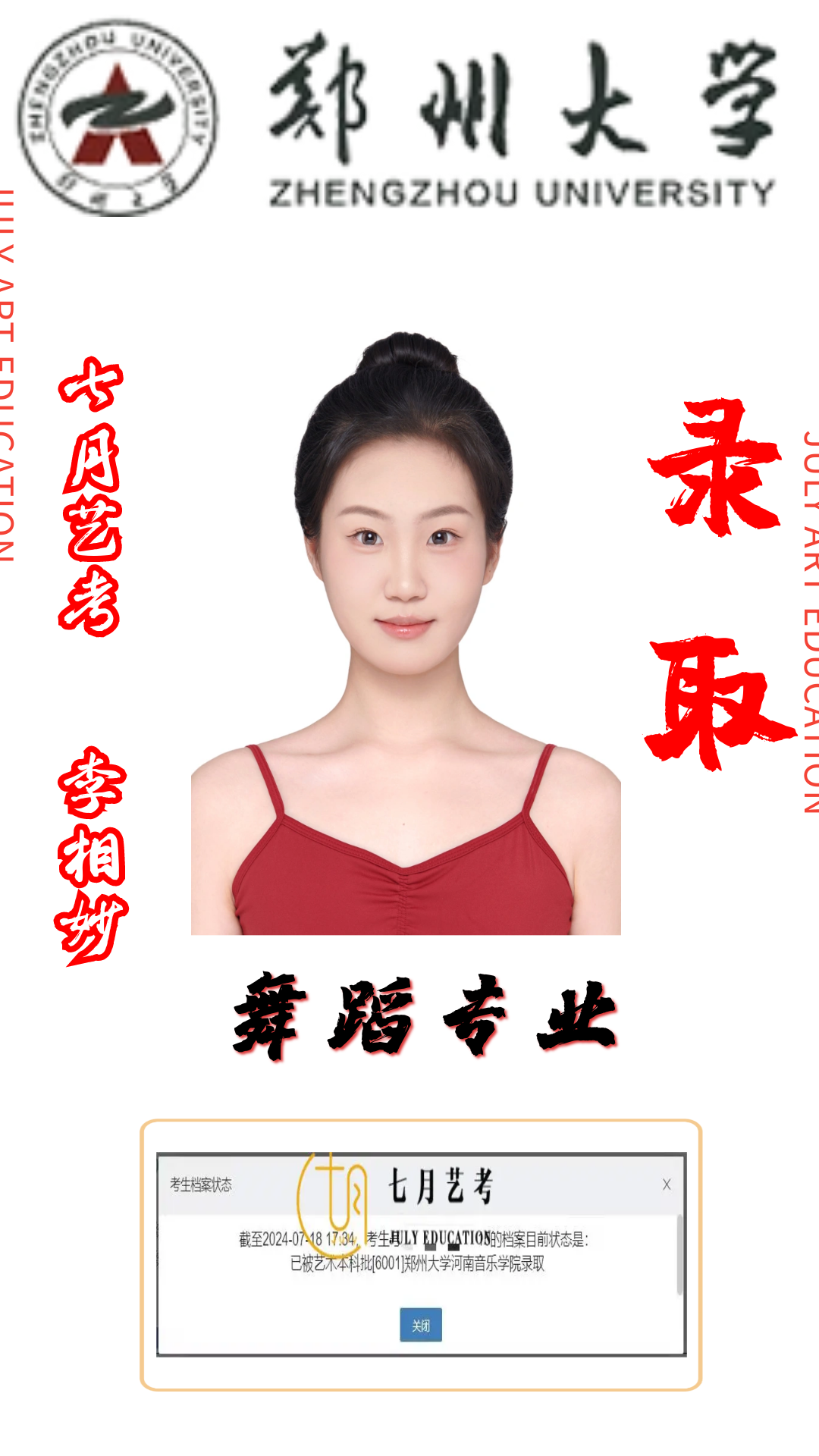 七月艺考占中央民族大学近五年来在河南省录取人数总比70%以上,其中23届郭馨文取得全国第*名的好* 校考战绩位居全国前列.